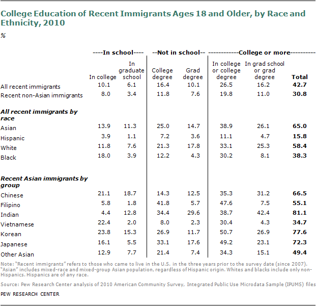 Among Asian immigrant adults ages 18 and older who arrived in 2007-2010, nearly two-thirds (65%) were enrolled in college or graduate school, or held a college degree. This share was higher than for comparable white recent immigrants (58%) and markedly higher than for black (38%) or Hispanic (16%) recent immigrants.