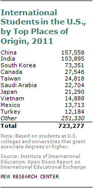 Young adults from Asian countries are overrepresented among current students, accounting for more than six-in-ten of all foreign students studying at U.S. institutions. China, India and South Korea are the top three countries whose students are studying in the U.S., with Taiwan ranking fifth (behind Canada) and Japan and Vietnam ranking seventh and eighth (behind Saudi Arabia).