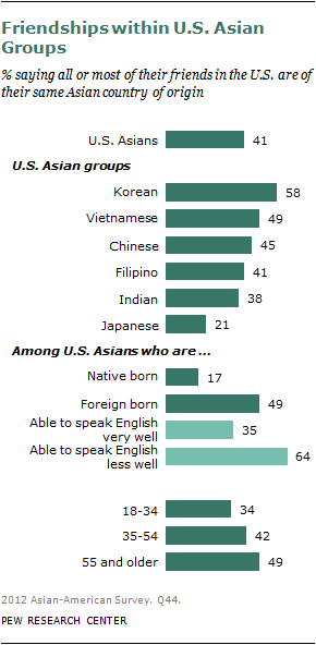 Asian Americans also reach across racial lines in other ways. For example, just four-in-ten (41%) say that a majority of their friends share their same Asian heritage. This figure rises to nearly half (49%) among Asians who are immigrants but drops to just 17% among those who were born in the United States.