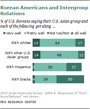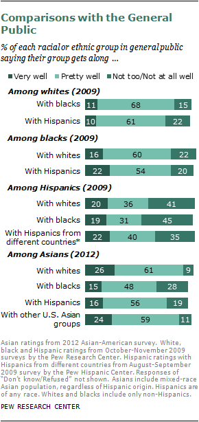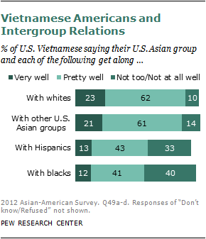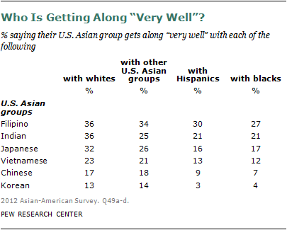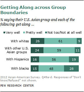 Do Asian Americans get along with other racial and ethnic groups? The Pew Research survey asked respondents to rate how well members of their Asian group (such as Vietnamese Americans, Korean Americans) get along with each of four groups: whites, blacks, Hispanics and Asian Americans from different countries.