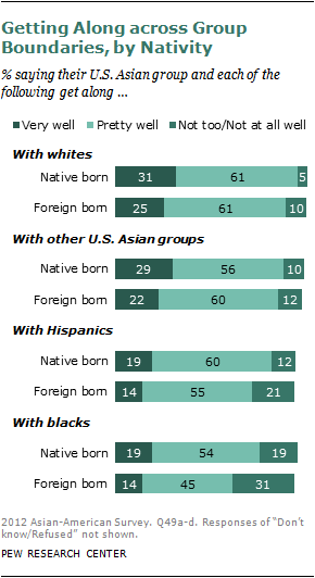 U.S.-born Asians tend to give more positive assessments than the foreign born about the relationship between their country of origin group and other racial and ethnic groups. For example, 31% of native-born Asian Americans say their country of origin group gets along “very well” with whites, compared with 25% of foreign-born Asian Americans who say the same.