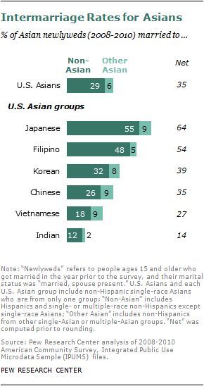 Among all Asian-American newlyweds from 2008 to 2010, 29% married someone who is not Asian and 6% married someone from a different Asian country of origin.58