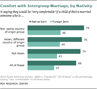 Taken together, 45% of Asian Americans would be “very comfortable” with all three of these situations: a child of theirs marrying someone who is not from their country of origin, Asian but from a different country of origin, and not Asian.