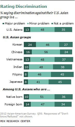 Perceptions of discrimination vary somewhat across U.S. Asian groups. Chinese and Korean Americans are more likely than other U.S. Asians to say that discrimination is either a major or minor problem. Korean Americans are more likely than other Asian groups to see discrimination as a major problem.