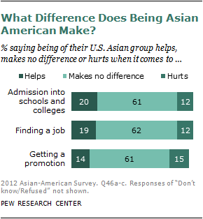 While some observers talk about a “bamboo ceiling” hindering the rise of Asian Americans to top positions, a majority of Asian Americans say that being Asian makes no difference when it comes to getting a promotion at work.62 Among all U.S. Asians, 61% say being from their Asian group makes no difference in promotion decisions once on the job; roughly equal percentages say being from their Asian group helps in getting a promotion (14%) as say it hurts (15%).