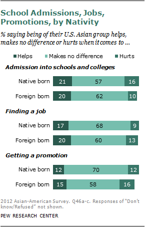 Native-born Asian Americans are less likely than those who are foreign born to see their country of origin as a factor when seeking a job and especially for getting a promotion. A greater share of the native born say being of their country of origin group makes no difference when it comes to getting a job or a promotion. And the native born are less likely than the foreign born to say that being of their country of origin hurts for getting a job or a promotion. This pattern differs, however, when it comes to gaining admission to schools and colleges. Native-born Asian Americans, more so than those who are foreign born, say being of their country of origin group hurts their chances of admission.