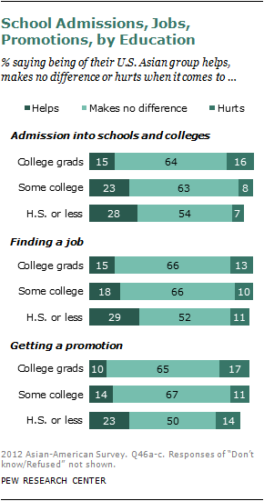 When it comes to getting a promotion, college graduates are more likely to say that being of their U.S. Asian group hurts (17%) than helps (10%); 65% say it makes no difference. Among those with a high school diploma or less, 23% say being of their Asian group helps, 14% say it hurts and half (50%) say it makes no difference.
