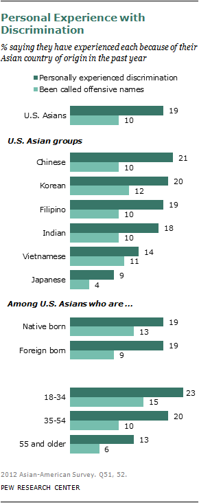 About two-in-ten (19%) Asian Americans say they have personally experienced discrimination because of their Asian heritage within the past year. One-in-ten (10%) say they have been called offensive names in the past year because of their Asian heritage.