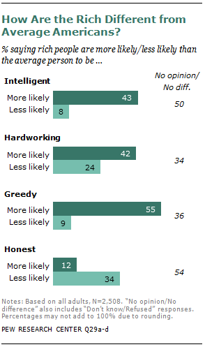 On the negative side, more than half of all adults (55%) say rich people are more likely than the average person to be greedy. Only 9% say they are less likely to be greedy. The remaining 36% have no opinion. About one-third of the public (34%) says the rich are less likely than average people to be honest. Only 12% say they are more likely to be honest, and 54% have no opinion on this.
