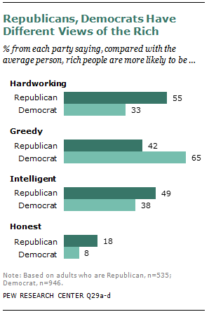 Republicans and Democrats view the rich differently. A much higher share of Republicans (55%) than Democrats (33%) say, compared with the average person, rich people are more likely to be hardworking. Republicans are also more likely than Democrats to view rich people as more intelligent than average. Roughly half of Republicans (49%) say rich people are more likely to be intelligent. Only 38% of Democrats agree.