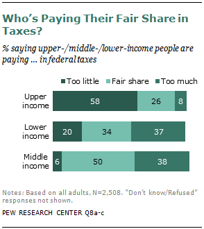 The public is divided over whether lower-income people pay the appropriate amount in federal taxes. Some 37% say lower-income people pay too much in taxes, while roughly as many (34%) say lower-income people pay their fair share in taxes. One-in-five adults say lower-income people pay too little in taxes. There is little agreement across social classes on this issue, with a plurality of lower-class adults (48%) saying lower-income people pay too much in taxes and a plurality (39%) of upper-income adults saying lower-income people pay their fair share. When it comes to the middle-class tax burden, there is no clear consensus among the public. Half of all adults say middle-income people pay their fair share in federal taxes. Nearly four-in-ten (38%) say middle-income people pay too much in taxes, and 6% say they pay too little.
