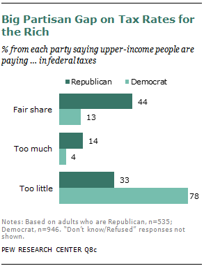 Partisanship is closely linked to views about federal taxes, and the biggest gaps emerge over tax rates for the rich. A solid majority of Republicans say upper-income people pay either their fair share (44%) or too much (14%). Among Democrats, a strong majority (78%) say upper-income people pay too little in taxes; only 33% of Republicans agree. Some 13% of Democrats say upper-income people pay their fair share in taxes, while 4% say the rich are paying too much.