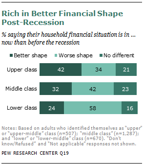 And the recession has had less of a long-lasting impact on the upper class. About four-in-ten upper-class adults (42%) say they are in better shape now than they were before the recession started in December 2007. About one-third (34%) say they are in worse shape, and 21% say their financial situation is unchanged. Among both the middle and lower classes, the assessments are much more negative. More than four-in-ten middle-class adults (42%) say they are in worse financial shape now than they were before the recession; 32% say they are in better shape. Among lower-class adults, 58% say they are in worse shape now, while only 24% say they are in better shape.