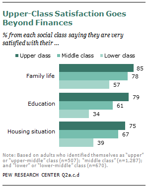 Upper-class adults are also more highly satisfied with their family life than are middle- and lower-class adults. Some 85% of those in the upper class say they are very satisfied with their family life, compared with 78% of middle-class adults and 57% of lower-class adults. Similarly, upper-class adults are more satisfied with their housing situation (75% very satisfied, vs. 67% of middle-class adults and 39% of lower-class adults) and with their education (79% vs. 61% and 34%, respectively).
