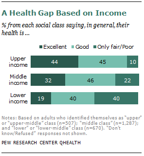 The survey also finds that the gap between rich and poor goes far beyond income. Adults who self-identify as being in the upper or upper-middle class are generally happier, healthier and more satisfied with their jobs than are those in the middle or lower classes. And they are much less likely to have suffered economic hardships as a result of the recession. In addition, those in the upper class are more satisfied than those in the middle or lower classes with their family life, their housing situation and their education. Upper-class Americans even report experiencing less stress. Only 29% of those in the upper class say they frequently experience stress, compared with 37% of those in the middle class and 58% of lower-class adults.