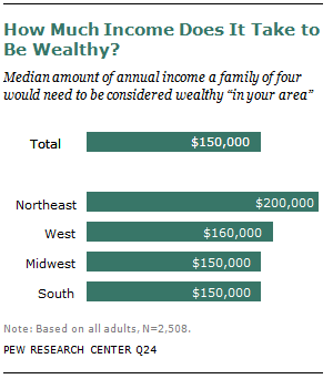 Because the cost of living varies widely across the country, estimates of how much income is needed to be considered wealthy differ across regions and types of community. Among those living in the Northeast, the median amount is $200,000. The median for those living in the West is $160,000, and for those in the South and Midwest it is somewhat lower ($150,000).