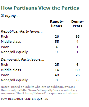 At the same time, most Democrats (59%) say their party favors the middle class. One-in-four Democrats (26%) say their party favors the poor, and 6% say it favors the rich. Republicans are much more likely than Democrats to say the Democratic Party favors the poor (48%). Only 14% of Republicans say the Democrats favor the middle class.