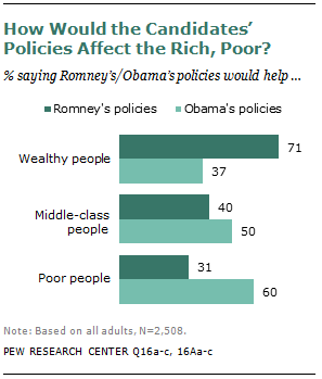 When it comes to the candidates themselves, the public sees a potential Romney presidency being much more beneficial for the rich than for the middle class or the poor. Fully 71% of all adults say that if Romney is elected president, his policies would help wealthy people. Less than half (40%) believe Romney’s policies would help the middle class, and only 31% think Romney’s policies would help the poor.5