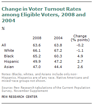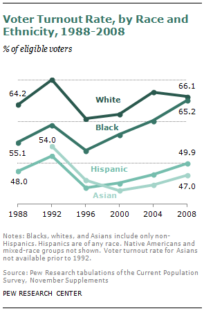 While the 2012 finding won’t be made public for several months, a backward look at recent trends from this data set is instructive. In 2008, according to the post-election census survey, the gap between white and black turnout was the smallest on record. Some 66.1% of all age and citizen eligible whites voted that year, compared with 65.2% of blacks, 49.9% of Hispanics and 47% of Asian Americans. The survey found that the white turnout rate had declined by 1.1 percentage points between 2004 and 2008, while the rates for the other groups all rose—by 4.9 percentage points among blacks, 2.7 among Hispanics and 2.4 among Asians.