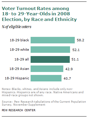 The post-election survey also showed that in 2008, young blacks (18 to 29 year olds) voted at a higher rate than young whites (58% versus 52%) – a difference that was almost certainly related to the historic nature of the Obama candidacy, but that might foreshadow patterns in political engagement among the Millennial generation that could persist throughout adulthood.