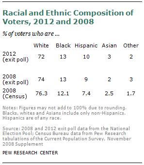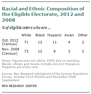 Even with that caveat in mind, the exit poll is instructive. As the tables show, in 2012 blacks and whites both appear to have cast a slightly higher shares of votes (72% and 13%, respectively) than their share of eligible voters (71% and 12%), while Hispanics and Asians cast a lower share of votes (10% and 3%) than their share of eligible voters (11% and 4%).