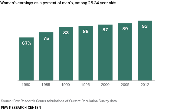 [bignumber]2[/bignumber] Young working women today are also making more money relative to men their age than their mothers and grandmothers did. This is due not only to the rising earnings of women, but also to the falling earnings of men. In 2012, young women earned 93% of the average hourly wage of men the same age.
