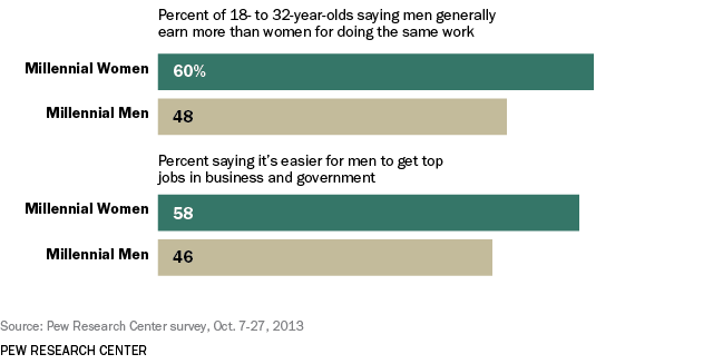 [bignumber]4[/bignumber] These dramatic gains among young working women haven’t translated to an increased optimism about their career paths. Young women today are more likely than young men to say women are paid less for doing the same job and men have easier access to top executive jobs.