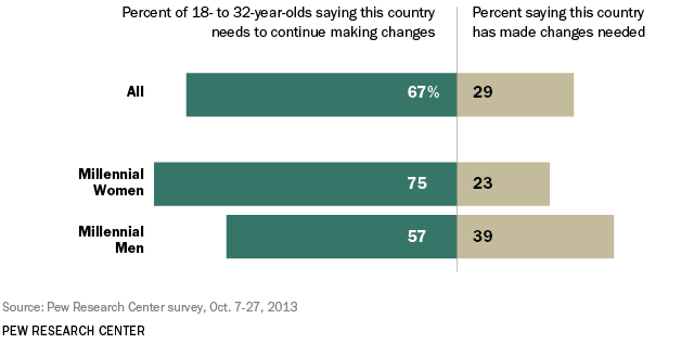 [bignumber]6[/bignumber] Women are much more likely than men to say more change is needed to achieve gender equality in the workplace. The gap is especially wide among Millennial women and men.