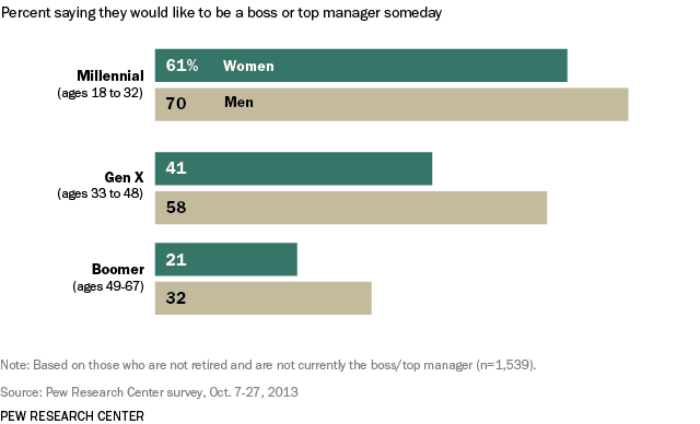 [bignumber]7[/bignumber] Women of all ages, just like men, want a secure job they enjoy, but they are less likely than men to ask for raises or aspire to top management jobs. This is especially true once they reach their 30s and 40s, when many men and women face the tradeoffs that go with being a working parent.