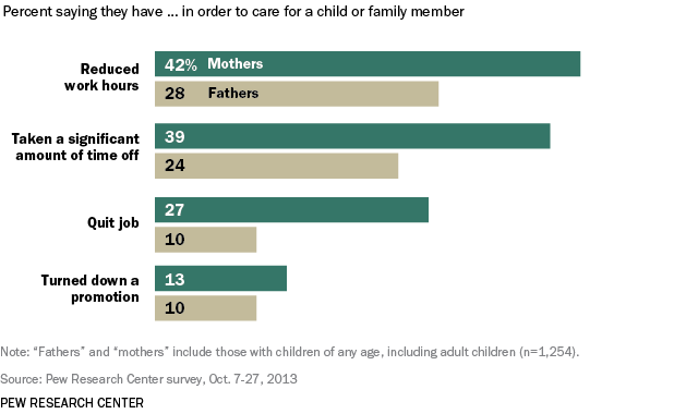 [bignumber]10[/bignumber] And among mothers and fathers who have taken a significant amount of time off from work to care for a family member, women are much more likely than men to say it hurt their career overall. Even so, about nine-in-ten mothers and fathers say they are glad they did it.