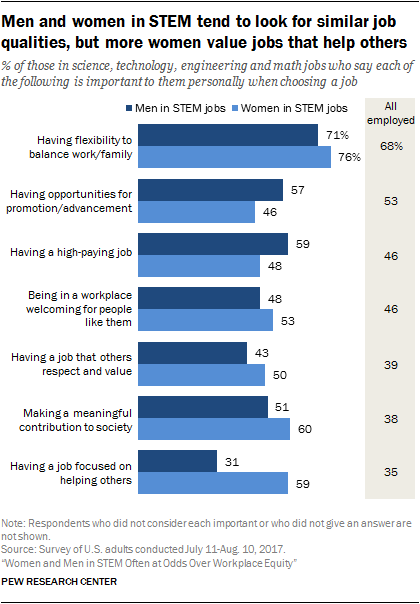 That flexibility is an important factor in choosing a job for both men and women in STEM, as well as those working in other areas. For the most part, men and women in STEM look for similar job qualities; one notable exception is that 59% of women tend to value jobs that help others, compared with 31% of men.