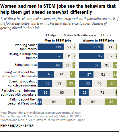 Men who work in STEM jobs are modestly more likely than women in such jobs to see working harder than others (71% vs. 63%), being assertive at work (66% vs. 57%) or being vocal about their accomplishments as something that helps them get ahead (43% vs. 37%).