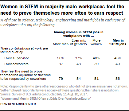 Although, overall, women in STEM jobs are just as likely as men in such jobs to say they feel highly valued by supervisors and coworkers, women working in majority-male environments also say they have to work harder to earn that appreciation compared with women in either majority-female or evenly-mixed gender settings.