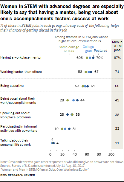 Women in STEM jobs see the behaviors that help them advance somewhat differently depending on their level of education. Those with advanced degrees are more likely than women in STEM with some college or less education to say that having a workplace mentor to advise them helps. And some 44% of women in STEM with a postgraduate degree say that being vocal about their accomplishments at work helps them get ahead; in contrast 28% of women in STEM jobs with some college or less education say the same.